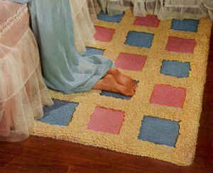 Materials: AMERICAN THREAD COMPANY “AUNT LYDIA’S” HEAVY RUG YARN: 24 skeins Cream, 7 skeins Pink, 8 skeins Light Blue; Yarn Needle.