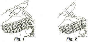 Insert hook through lps on finger following direction indicated by arrow (see Fig. 1), being careful to hook all loops (see Fig. 2), draw through st pulling each lp to measure approximately 1”, remove finger from lp, yo and draw through all lps on hook.