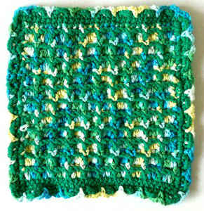 Designer Kathleen Stuart wrote: “The Framed Puff Stitch dishcloth is another idea from a baby afghan that I designed. When I originally designed the pattern, you needed to cut the yarn after each row. This time instead of cutting the yarn after every row, I left a loop from the working color, removed the hook and started the next row. I really don’t like weaving in ends, so this solved my problem. I also added a fun border to this dishcloth using chain loops. This dishcloth is reversible, with a very different look on each side.”