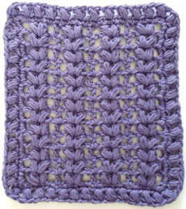 Rows 2-13: Ch 3 (counts as first dc now and throughout), turn, (puff, ch 1, puff) in sp between puff sts, ch 1, dc in next dc, * ch 1, (puff, ch 1, puff) in next sp between puff sts, ch 1, dc in next dc; rep from * across. (4 puff-groups and 5 dc)