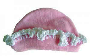 Materials: Small amount White (W) Size 3 Crochet Thread; Baby Hat; Awl (available at any hardware store); Cork Board; Fabric Marking Pen; Yarn Needle. Aunt Lydia’s Fashion 3 Thread was used in model.