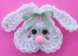 Materials: : Crochet Hook size H, 7 yds white worsted yarn, pink 1/2” pompon, 2 – 12 mm moveable eyes, and 4” ribbon 1/4” wide, glue.