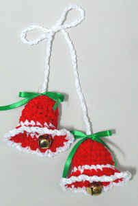 Tie a bow with chain. Insert one end of chain through center top of Bell. Tie a knot on end inside Bell. Rep for second Bell.